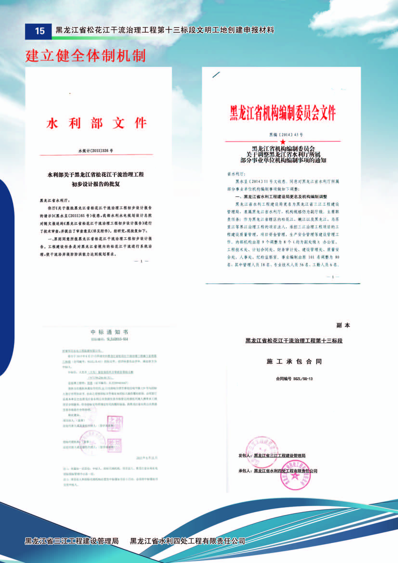 2015822日,經(jīng)過公開評(píng)標(biāo),松花江干流治理工程第十三標(biāo)段確定施工中標(biāo)單位為黑龍江省水利四處工程有限責(zé)任公司,合同金額為1.23億元,合同工期489日歷天。