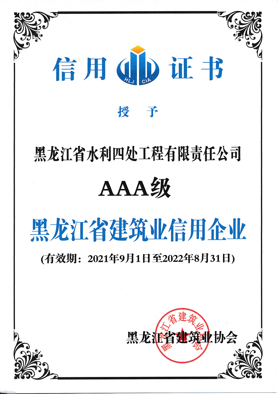經(jīng)綜合評(píng)審,我公司再次被黑龍江省建筑業(yè)協(xié)會(huì)評(píng)為 “黑龍江省建筑業(yè)AAA級(jí)信用企業(yè)”,2015年迄今,我公司已連續(xù)6年保持該稱號(hào)。