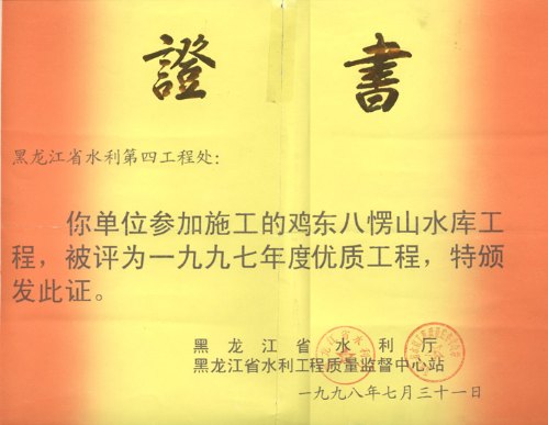 雞東八楞山水庫(kù)優(yōu)質(zhì)獎(jiǎng)證